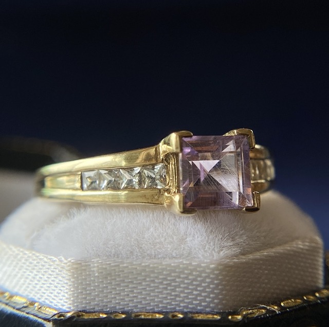 美しいスクエアカットが印象的なアメジストがセッティングされたリングです。 両サイドには同じくスクエアカットされたホワイトトパーズがセッティングされています。 全てがスクエアカットの宝石で構成されているため、すっきりとした大人の印象のリングです。 ベースは9金。 イギリスヴィンテージリングですので少々傷が見られますが歴史の一部としてお楽しみいただければと思います。 ※ケース等は付属しません。 SIZE(㎜) リングサイズ 13号 中央アメジスト 縦5 横5