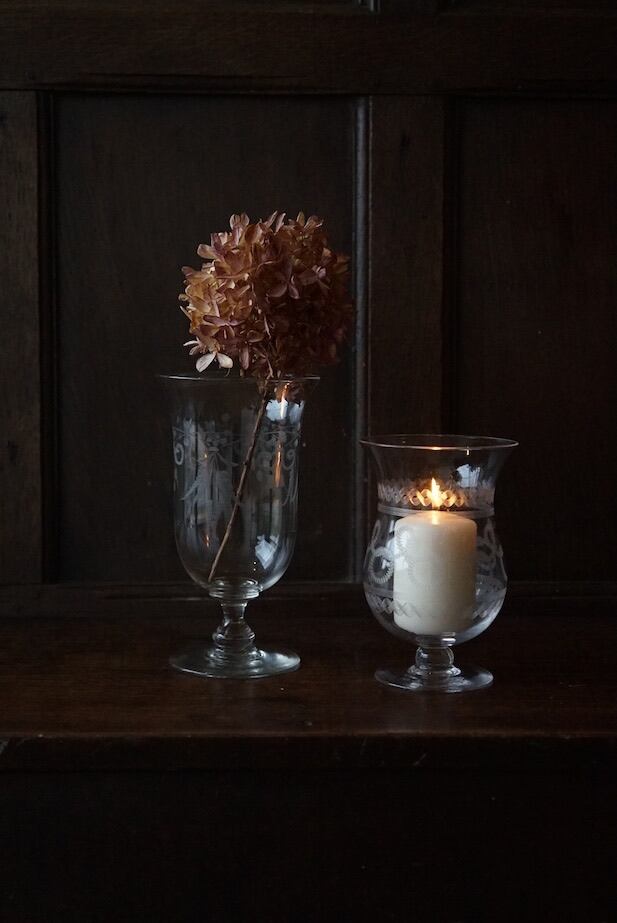 1900年前後、イギリスで作られた、繊細なエッチングが施されたクリスタルガラスのフラワーベースです。