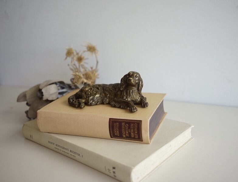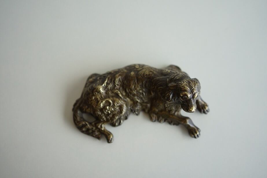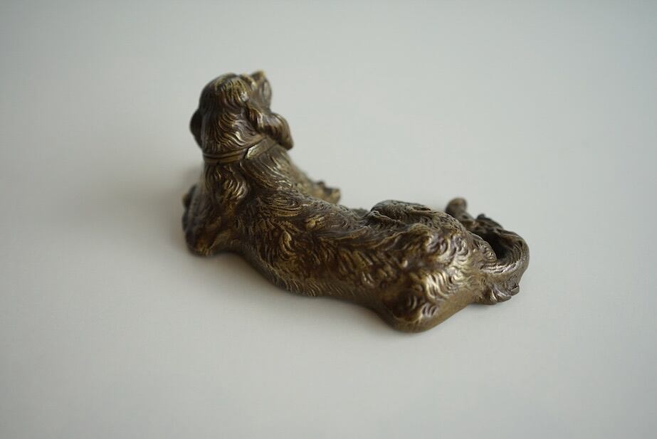 優雅に横たわる犬をモチーフにした、真鍮製の置物です。