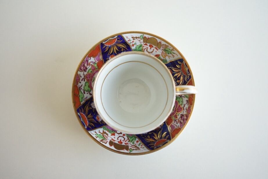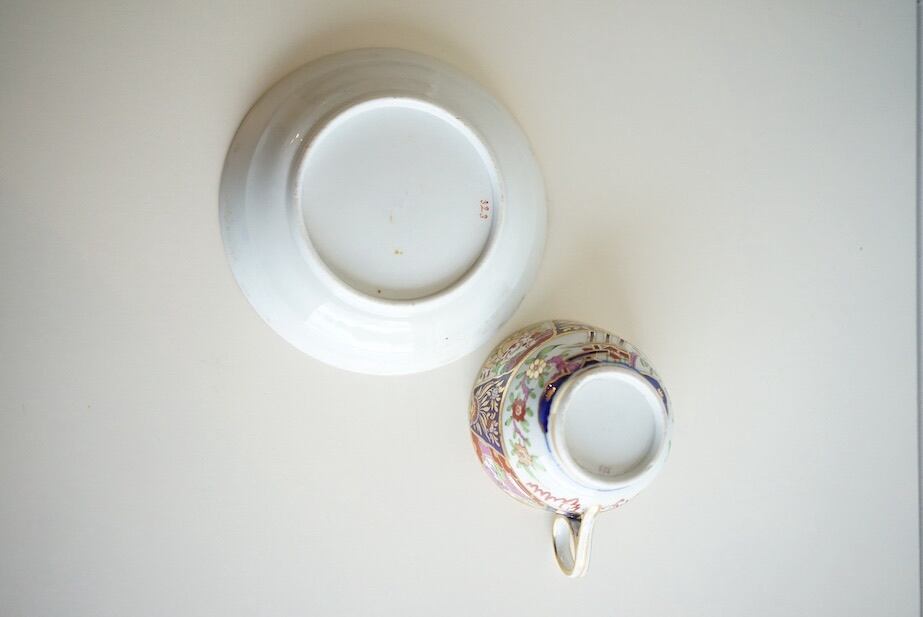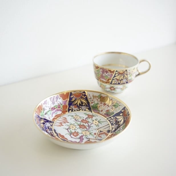 ソーサーに見られる雲や御殿の礎台の表現は、当時の英国人絵付け師の解釈が加わった、素朴で愛らしい描写です。また、四つの区画に分かれたデザインも印象的。巧みに描かれた山や花は、繊細な美しさを醸し出しています。