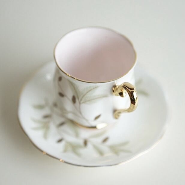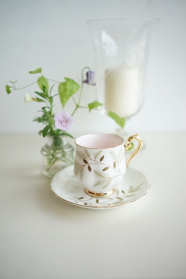 カップの内側には淡いピンク色の彩色が施されており、外側の白いボーンチャイナとのコントラストが、可憐で優雅な雰囲気を醸し出しています。