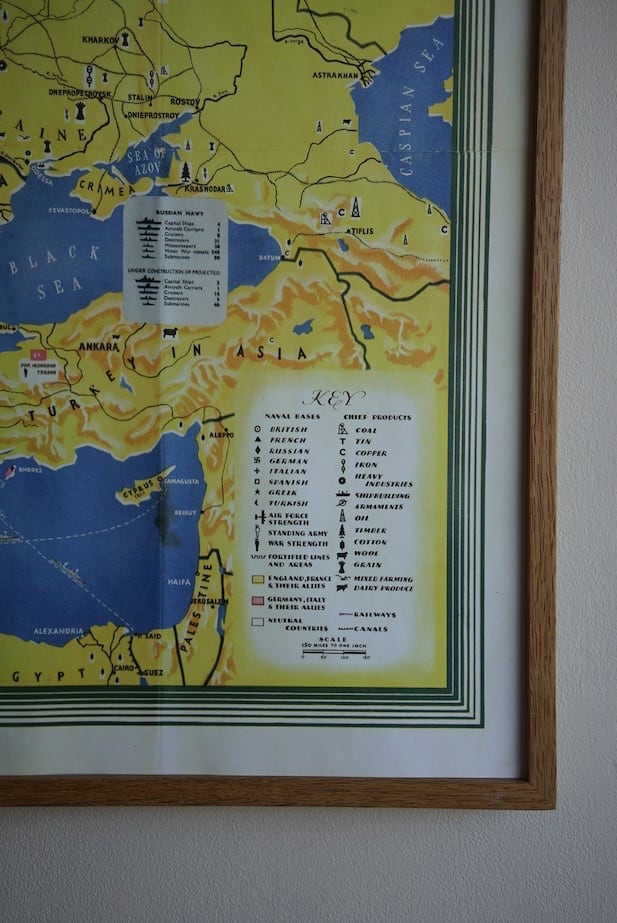 地図が持つ本来の美しさに加え、情報量のあるデザインと地政学的な背景が重なり、視覚的にも知的にも奥行きのある一枚です。