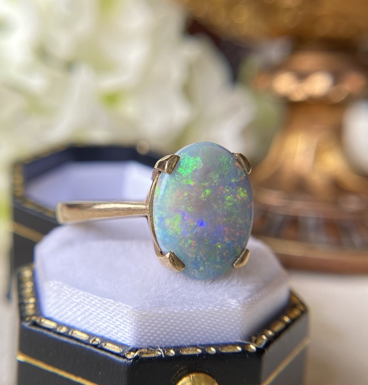 地金は9カラットゴールドではありますが、大きめのオパール石は游色があり大変美しいです。