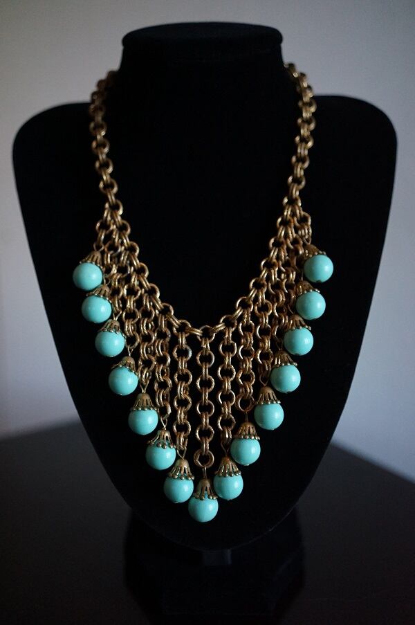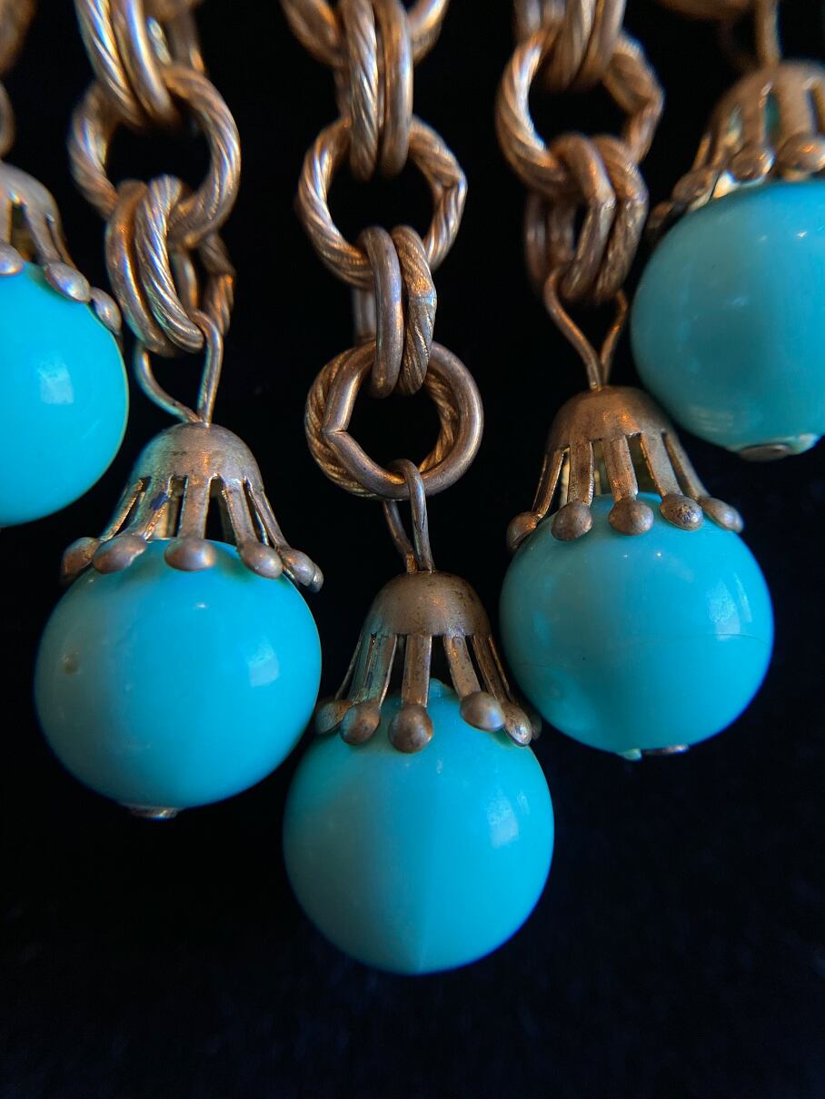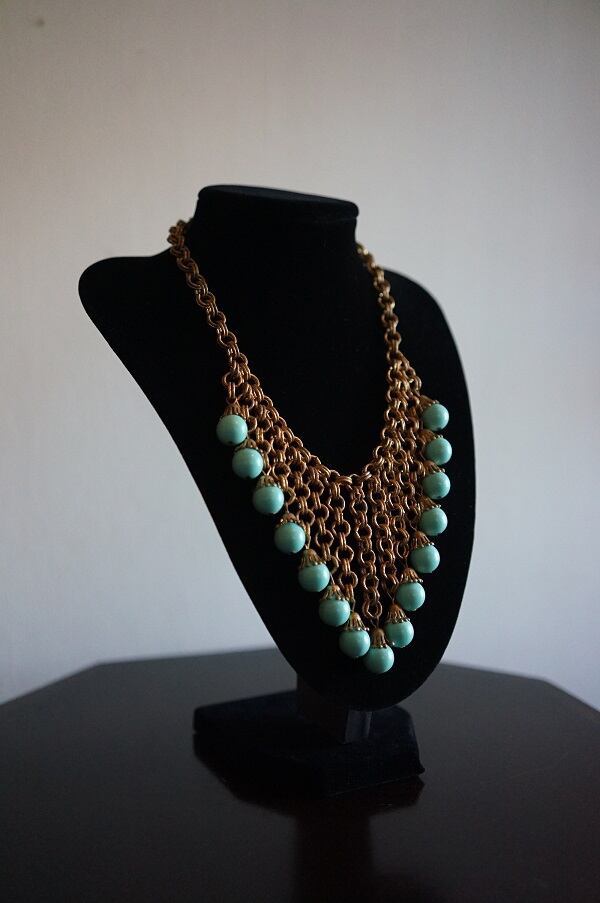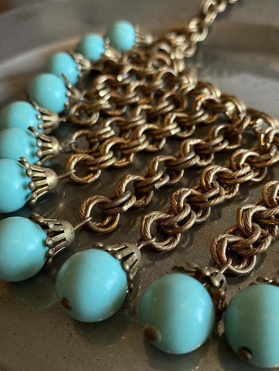 水色のビーズとチェーンが印象的なネックレスです。