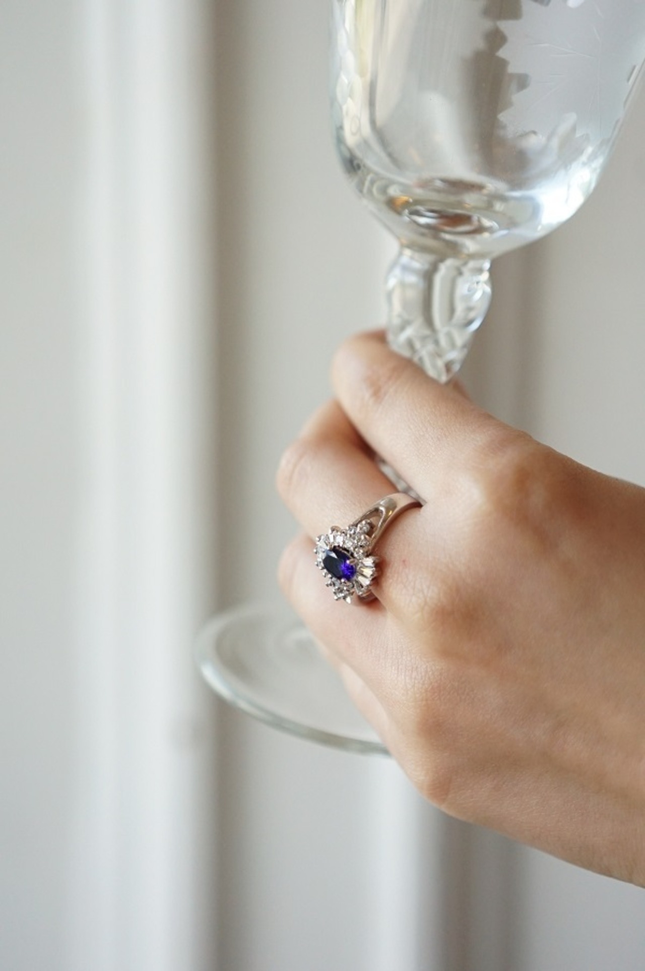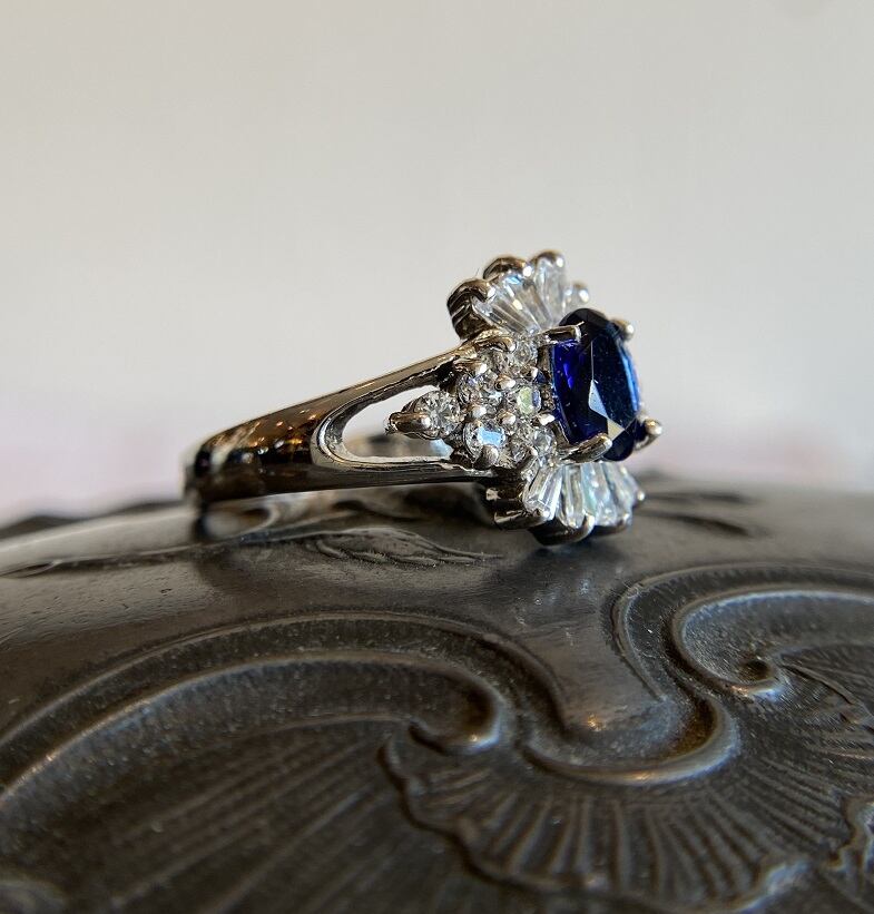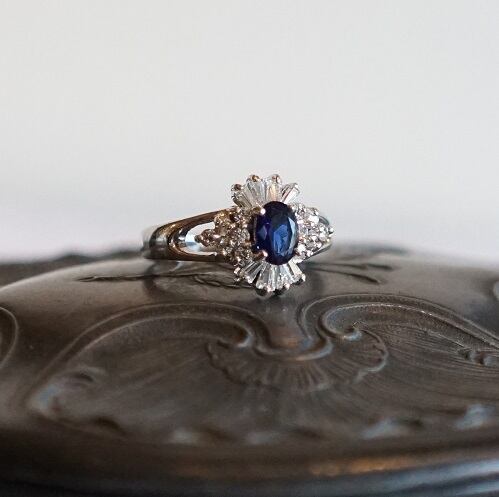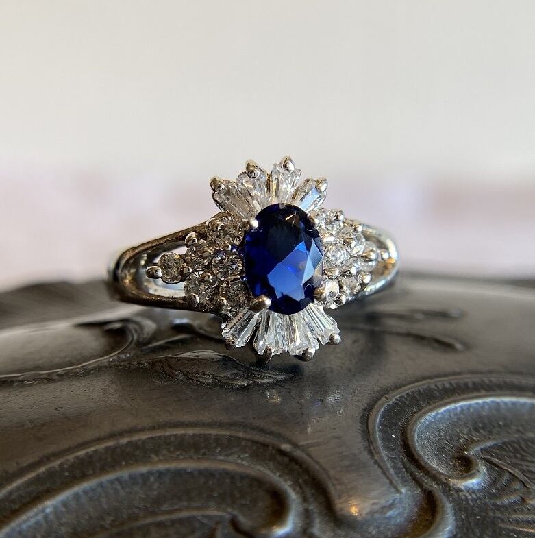 ベースはシルバーで、センターに大きめのサファイヤカラーのジルコニアがセッティングされていて、その周りを囲むように人工ダイヤが2種類のカットで立体的にセッティングされています。